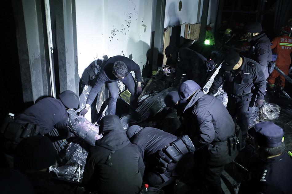 2019年12月3日,浙江海寧,救援人員在現場搶險搜救。世紀特邦圖      12月3日17時19分許,海寧市許村鎮蕩灣工業園區內海寧市龍洲印染有限責任公司發生污水罐體倒塌事故。此次事故目前已經造成9人死亡,另